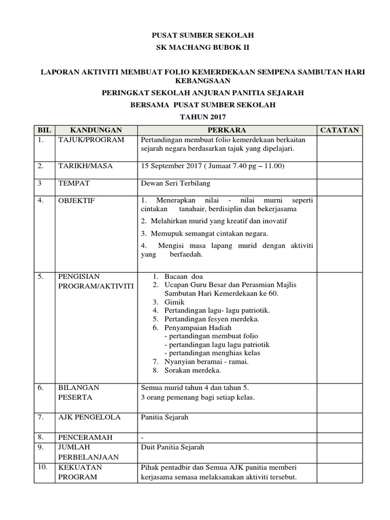3 Laporan Folio Kemerdekaan from imgv2-2-f.scribdassets.com Pada hari peringatan kemerdekaan ini, upacara bendera di istana merdeka dipimpin langsung oleh presiden. Tepat tanggal 17 agustus 2017, bangsa indonesia memperingati hari kemerdekaan indonesia yang ke 72. Kemerdekaan indonesia ini tentunya memiliki makna yang sangat besar bagi seluruh warga indonesia. Lirik lagu hari merdeka tujuh belas agustus tahun empat lima itulah hari kemerdekaan kita hari merdeka nusa dan bangsa hari. Tetap jaga kesehatan di era pandemic saat ini ya, oh iya gak kerasa ya sudah masuk. Hari kemerdekaan republik indonesia pada tanggal 17 agustus sebentar lagi akan di rayakan. Segala perancangan dan persiapan untuk sambutan dilakukan seminggu sebelum sambutan iaitu aktiviti sepanjang bulan kemerdekaan. Dalam rangka memperingati hari kemerdekaan republik indonesia, pt kcj mengadakan upacara dan program khusus.