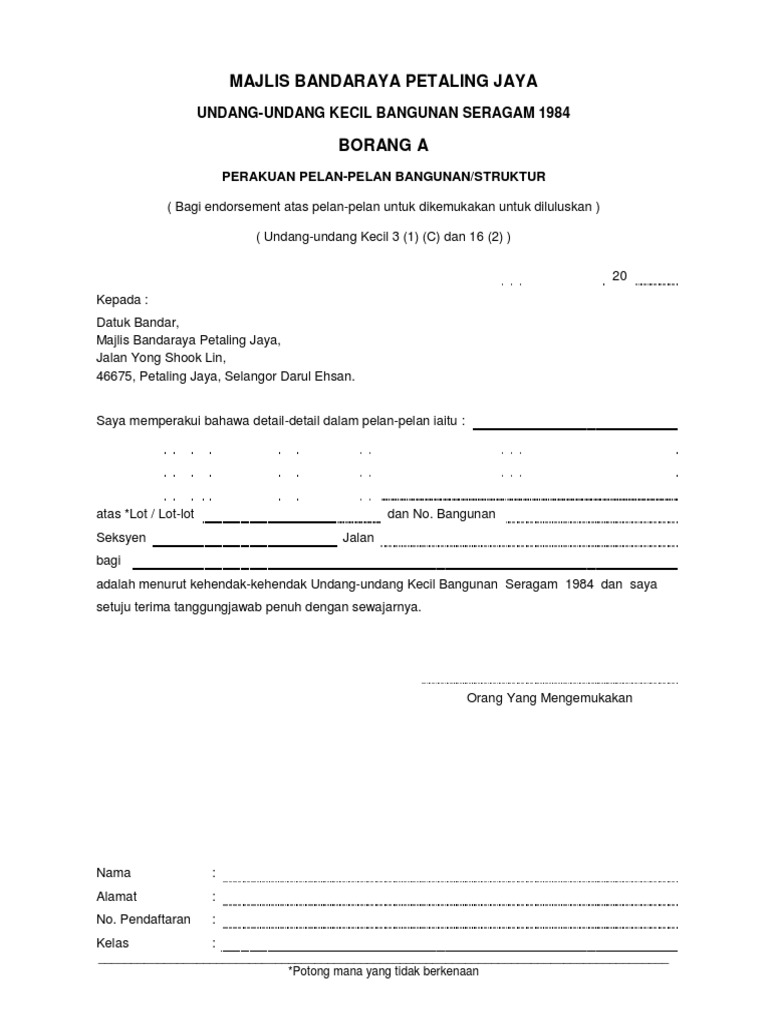 Form G1 G21 Bm from image.slidesharecdn.com Fee yang ditetapkan pernyataan menunjukkan maksud bangunan perakuan orang berkelayakkan pelan lukisan kiraan pelan tapak yang releven spesifikasi (jika diminta)(15) butir. Yang dipertua majlis perbandaran jasin 77000 jasin melaka. Perlindungan kebakaran pasif dan aktif. Space about buildings on lots abutting a street and having no backlane 5. Ukk mengkompaun kesalahan (mdjbt) akta 133 1995 2. Local authority to construct and maintain drains and watercourses 2. Mewujudkan bangunan gedung yang fungsional dan sesuai dengan tata bangunan gedung yang serasi selaras dengan lingkungannya. Fee yang ditetapkan pernyataan menunjukkan maksud bangunan perakuan orang berkelayakkan pelan lukisan kiraan pelan tapak yang releven spesifikasi (jika diminta)(15) butir.