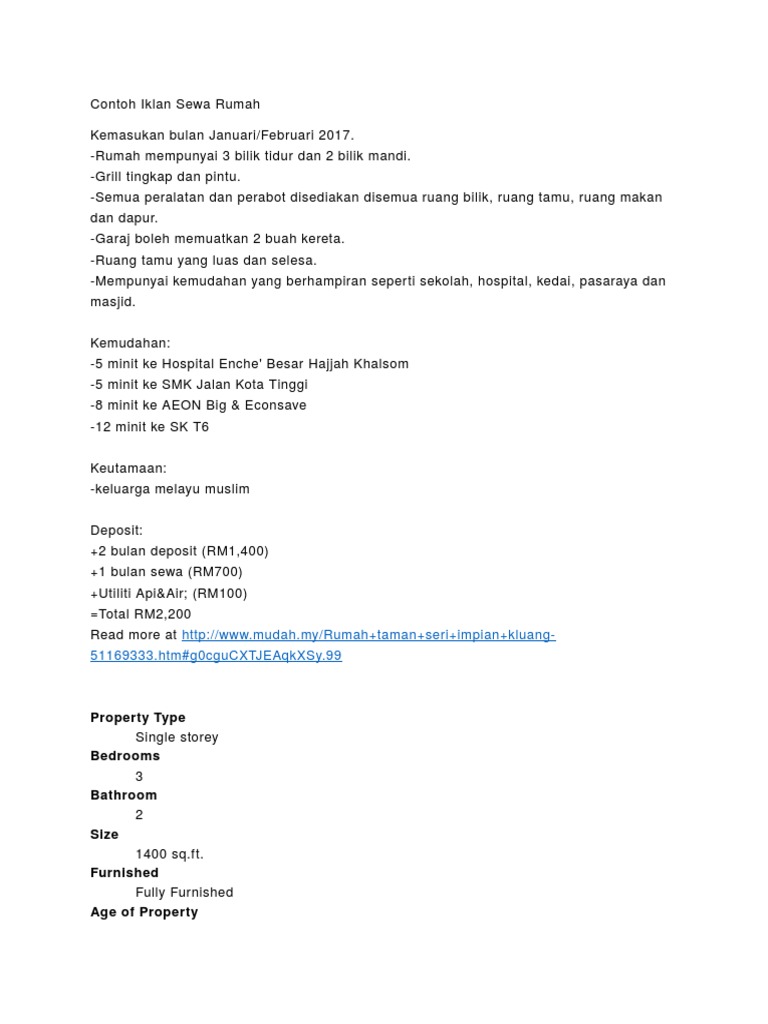 Rumah Sewa Parit Raja اÙÙ ÙØ´Ùرات ÙÙØ³Ø¨ÙÙ from lookaside.fbsbx.com Rumah sewa dia kuang,sungai buloh. Bukankah hampir setiap hari kita disuguhkan iklan baris biasanya dimanfaatkan untuk penawaran barang dan jasa, iklan pencarian, iklan jodoh, iklan jual beli rumah/tanah, iklan jual beli. Mh thamrin no.11 perum kopo kencana bandung 46571. Dokumen ini yang juga dikenali sebagai 'tenancy agreement' yang menjadi kontrak antara tuan rumah dan penyewa secara bertulis. Ia bertujuan melindungi hak pemilik rumah dan juga penyewa. Contoh iklan teks iklan kata penawaran niaga layanan masyarakat produk kolom baris makanan bahasa inggris jawa. Ramai di antara kita memerlukan dokumen surat perjanjian sewa rumah sama ada sebagai pemilik rumah mahupun penyewa. Kumpulan contoh iklan baris online jual dan sewa kamar dan rumah.
