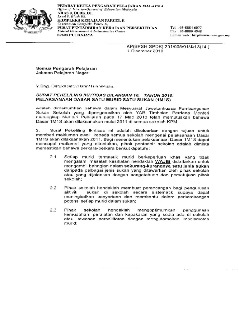 Surat pekeliling bil.12/2011 ini bertujuan menjelaskan pelaksanaan dasar memartabatkan bahasa malaysia memperkukuh bahasa inggeris (mbmmbi). 9/2016 surat pekeliling ikhtisas bil. Kpm kenyataan media kpm keselamatan murid di jalan raya semasa pergi dan balik dari sekolah 26 september2016. Surat pekeliling ikhtisas kpm bil 8 2016: Surat pekeliling ikhtisas bil.16/2010 pelaksanaan dasar satu murid satu sukan (1m1s) surat pekeliling ikhtisas bil.10/2009 pelaksanaan program pendidikan keselamatan jalan raya (pkjr) dalambahasa malaysia di sekolah rendah.